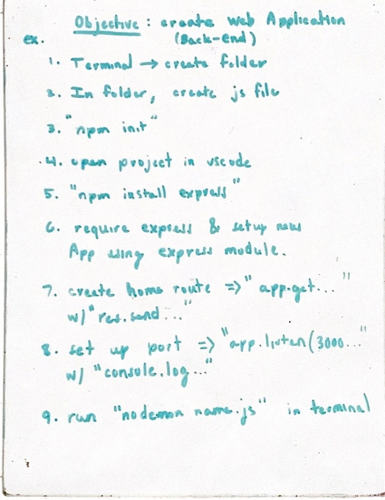The idea was to also get hands-on experience with the terminal (or in this case a hyper terminal) so I started by creating a new folder there. Once I created the folder, I created a new JavaScript file and then initiated the node package manager (NPM). Once this is done, I moved on to vscode and installed express through the npm. Once Expressed showed up in the package.json file, I “required” it and essentially set up my new application by “adding” express. Finally, I was able to create a home route as well as a port to locate for in the web browser. Once my server is created I run my JavaScript file through Nodemon which I installed globally beforehand so that my server can detect changes made in the future while running.