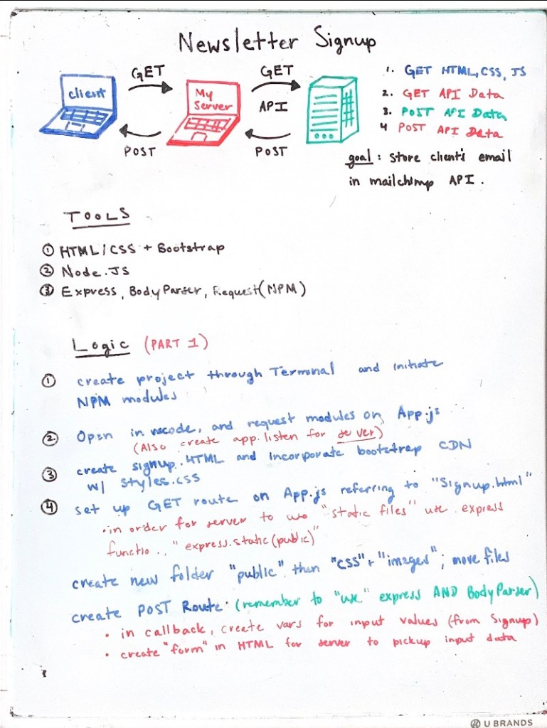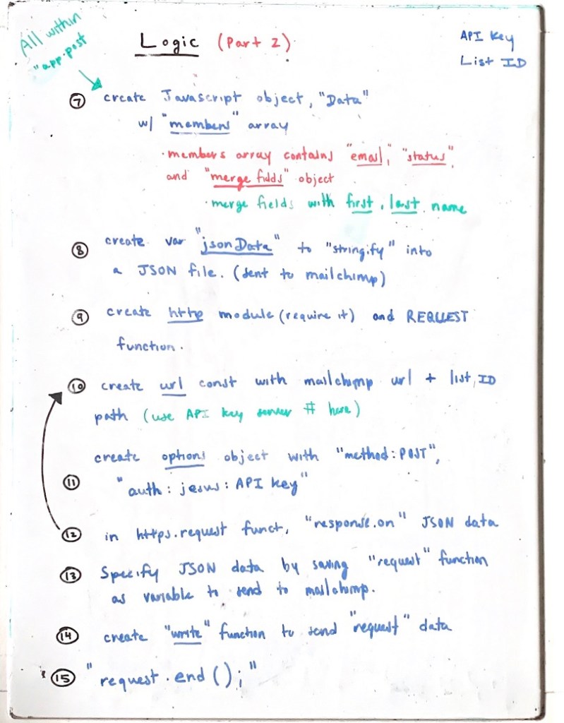 Lately, I’ve been able to work on a small project that culminates many of the tools and frameworks I’ve gotten to learn about. It’s a simple Newsletter Signup page but it does the job well. Essentially, the webpage would first allow clients to access it through their server where in which they would simply write their name and email so that I could store that information through my server as a POST request to the mailchimp API server. I divided the project into three parts and used a variety of tools to code and deploy (it’s not mentioned but I used Heroku) this simple Signup page. I’ve decided to add additional images of the logic I implemented for those who wish to go into more detail.